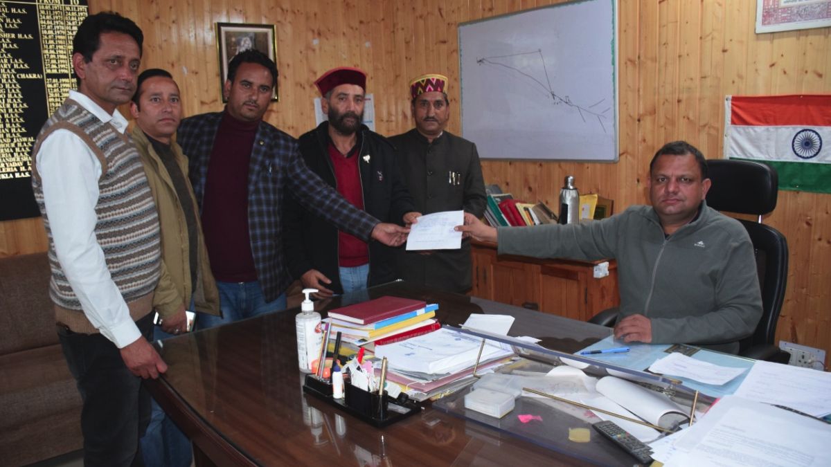 कुल्लू सदर से महेश्वर सिंह का टिकट कटने के बाद भाजपा की ओर से नरोत्तम सिंह पार्टी के पदाधिकारियों के साथ नामांकन पत्र दाखिल करते हुए।