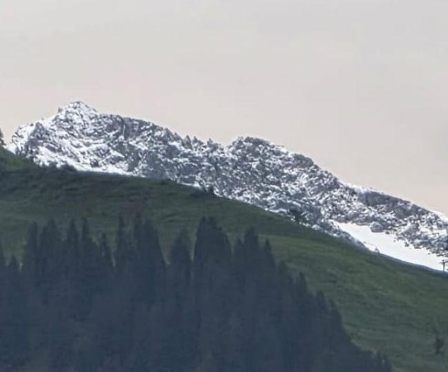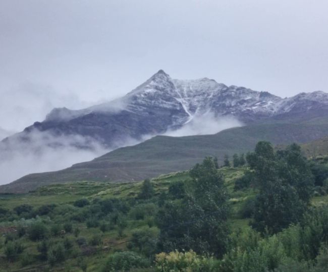 जुलाई में बरसात के मौसम में लाहुल की पहाड़ियों पर गिरी बर्फ का सुंदर व विहंगम दृश्य।