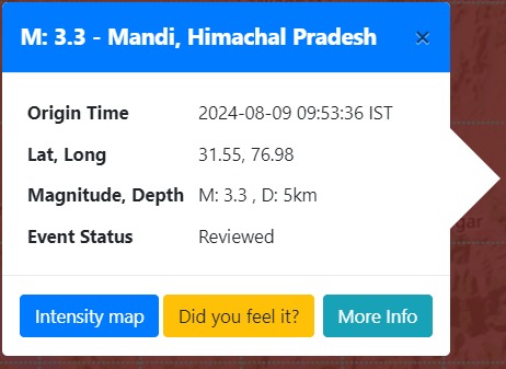 डिजिटल डेस्क, मंडी। हिमाचल प्रदेश में बादल फटने के बाद अब मंडी में भूकंप के झटके महसूस किए गए हैं। रिक्टर स्केल पर भूकंप की तीव्रता 3.3 आंकी गई है। वहीं इसका केंद्र जमीन के पांच किलोमीटर के भीतर की गहराई पर था। वहीं भूकंप में किसी भी जानमाल का नुकसान नहीं हुआ है।