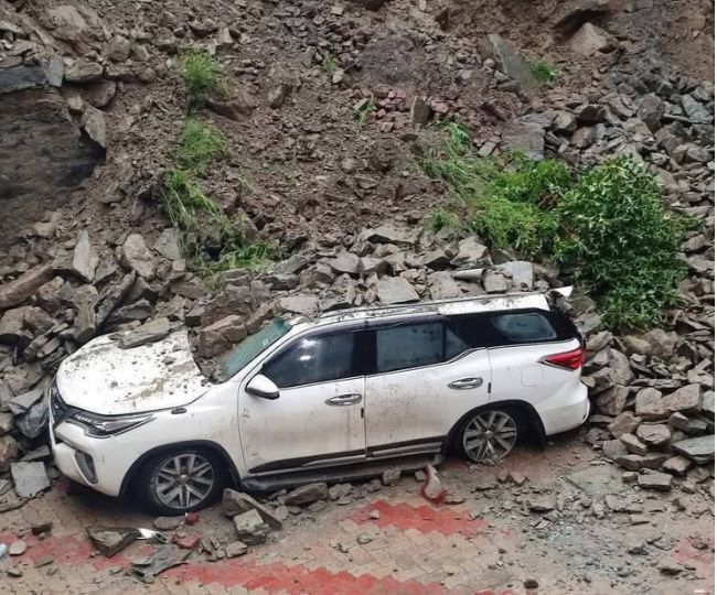 थलौट पेट्रोल पंप पर भूस्खलन की चपेट में आई गाड़ी