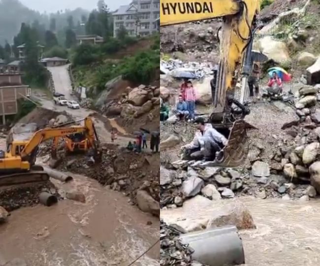 Himachal Pradesh: बाढ़ में बह गया पुल तो जेसीबी मशीन के पंजे पर बैठकर आफिस पहुंचे तहसीलदार थुनाग व स्टाफ, VIDEO