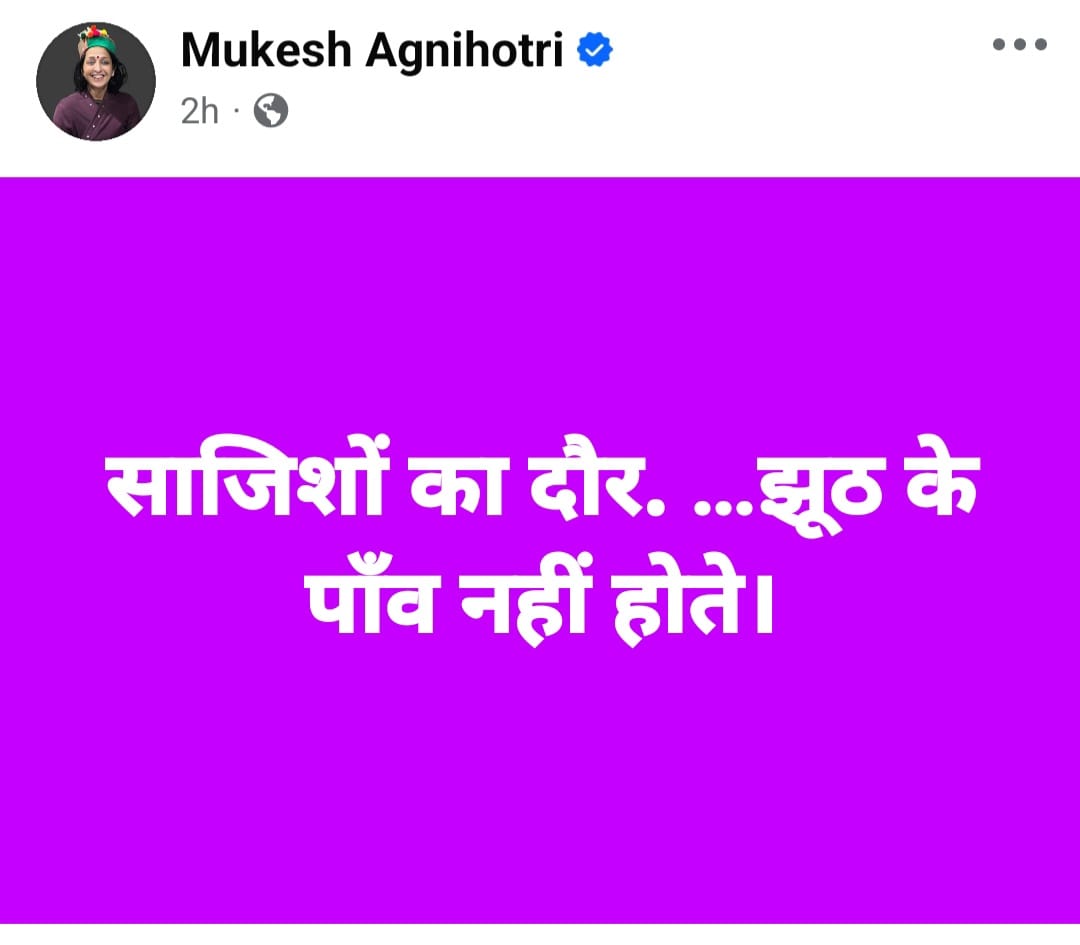राज्य ब्यूरो, शिमला। उप मुख्यमंत्री मुकेश अग्निहोत्री की इंटरनेट मीडिया पर पोस्ट से राज्य की सियासत एक बार फिर गरमा गई है। मुकेश अग्निहोत्री ने शनिवार अपने फेसबुक पेज पर लिखा... ‘साजिशों का दौर, झूठ के पांव नहीं होते’। शिमला से लेकर दिल्ली तक उनकी इस पोस्ट को लेकर सियासत गर्म रही। मुकेश मंजे हुए राजनीतिज्ञ है, सामान्यत: वह ऐसी कोई पोस्ट नहीं करते तो अनावश्यक चर्चा का विषय बने।