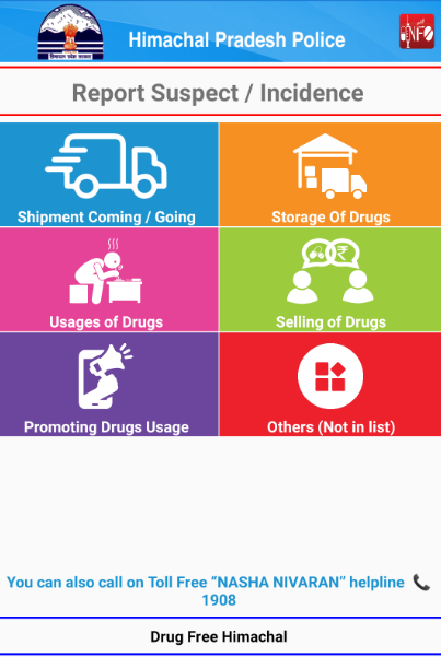 मादक पदार्थों की तस्करी के बारे में खुफिया जानकारी प्रदान करने के लिए "ड्रग फ्री हिमाचल" नामक एप भी शुरू की गई है। इस पर कोई भी व्यक्ति कहीं से भी नशे की सप्लाई और कारोबार के बारे में पुलिस को गुप्त सूचना दे सकता है। एप के माध्यम से सूचना देने वाले का नाम, मोबाइल नंबर और आईपी एड्रेस का पुलिस को भी पता नहीं चल पाता।