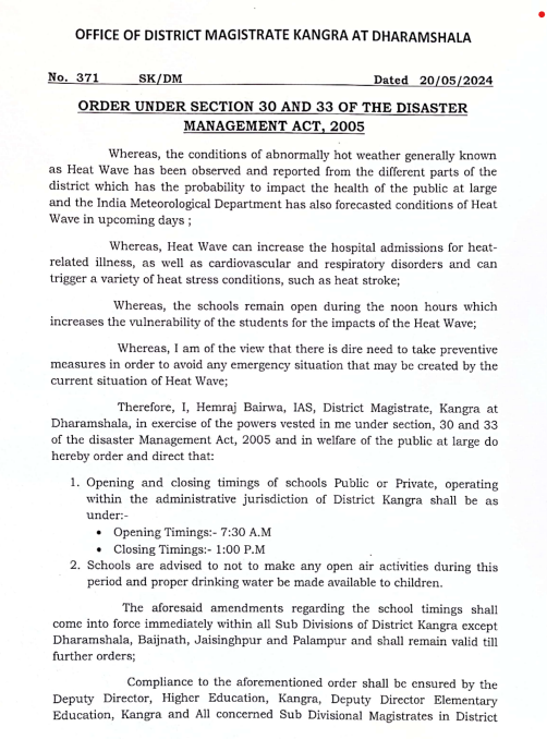 डीएम ने कहा कि स्कूल समय के संबंध में उपरोक्त संशोधन धर्मशाला, बैजनाथ, जयसिंहपुर और पालमपुर को छोड़कर जिला कांगड़ा के सभी उपमंडलों में तुरंत लागू होंगे और अगले आदेशों तक वैध रहेंगे। भारत मौसम विज्ञान विभाग ने भी हीट वेव की स्थिति की भविष्यवाणी की है आने वाले दिनों में यह और बढ़ सकता है।