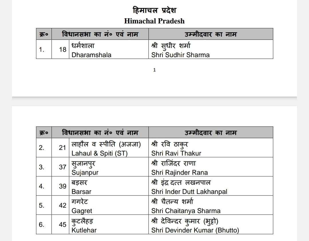 भाजपा ने धर्मशाला से सुधीर शर्मा, लाहौल और स्पीति (SC) से रवि ठाकुर, सुजानपुर से राजिंद्र राणा, बड़सर से इंद्रदत्त लखनपाल, गगरेट से चैतन्य शर्मा और कुटलैहड़ से देविन्दर कुमार (भुट्टो) को उतारा है। इन सीटों पर ये नेता पहले भी विधायक रह चुके हैं। अब चुनावी मैदान में ये भाजपा की ओर से चुनाव लड़ेंगे।