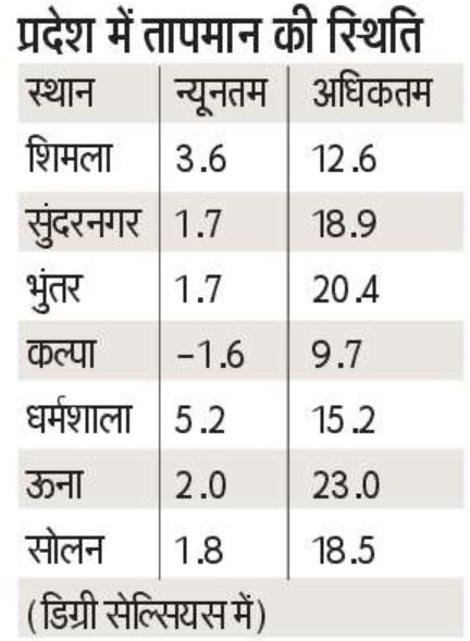 प्रदेश में न्यूनतम तापमान में एक से तीन डिग्री सेल्सियस तक वृद्धि दर्ज की गई है। ऊना में सबसे अधिक तीन डिग्री व अन्य क्षेत्रों में एक से दो डिग्री सेल्सियस तक वृद्धि हुई है। अधिकतम तापमान में दो से तीन डिग्री सेल्सियस की गिरावट आई है, जबकि ऊना में 3.2 डिग्री सेल्सियस की वृद्धि दर्ज की गई है। लोगों को उम्मीद थी कि पश्चिमी विक्षोभ का प्रदेशभर में कुछ असर होगा, जिससे वर्षा और हिमपात होगा।