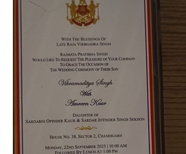 हिमाचल प्रदेश सरकार में मंत्री विक्रमादित्य सिंह की शादी का कार्ड।