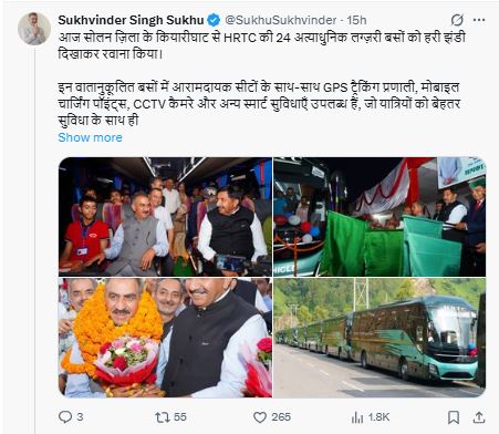 ढाई साल के कार्यकाल में एक हजार के करीब नई डीजल व इलेक्ट्रिक बसें, टैंपो ट्रैवलर व वॉल्वो बसों को खरीद की जा रही है। यह बात मुख्यमंत्री सुखविंदर सिंह सुक्खू ने बुधवार शाम को सोलन जिला के क्यारीघाट में आयोजित एक कार्यक्रम में कही।