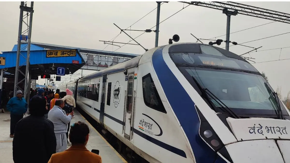 दिल्ली से हिमाचल के ऊना के लिए चलने वाली वंदे भारत एक्सप्रेस शनिवार को अपने निर्धारित समय से करीब 45 मिनट देरी से अंब-अंदौरा रेलवे स्टेशन पहुंची। ट्रेन का तय समय सुबह 11:05 बजे था, लेकिन धुंध के कारण यह 12:04 बजे स्टेशन पर पहुंची।