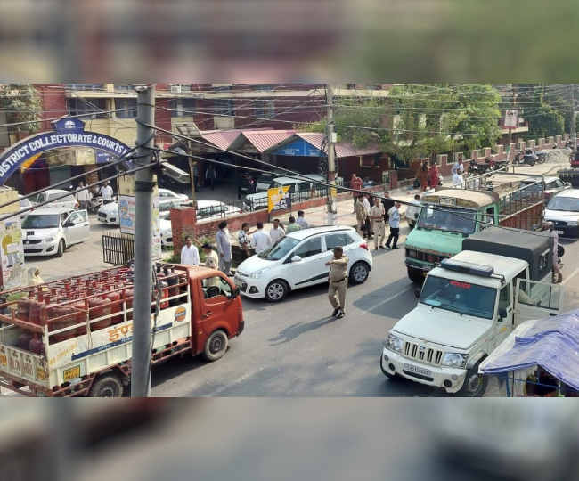ऊना के अदालत के बाहर सडक पर खड़ी चंडीगढ़ पुलिस की गाड़ी, जहां से कैदी फरार हुआ।