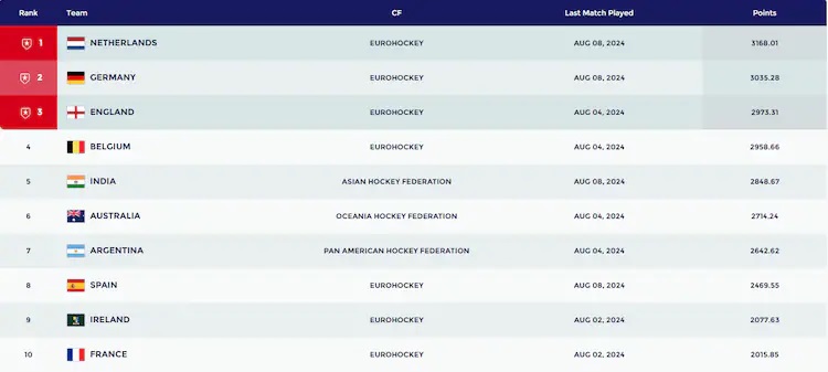 पेरिस ओलंपिक्स में गोल्ड मेडल जीतने वाली नीदरलैंड्स की टीम का रैंकिंग्स में शीर्ष स्थान पर दबदबा बरकरार है। नीदरलैंड्स के 3168.01 अंक हैं। पेरिस ओलंपिक्स में सिल्वर मेडल जीतने वाली जर्मनी की टीम 3035.28 अंक के साथ दूसरे स्थान पर काबिज है। इंग्लैंड की टीम 2973.31 अंक के साथ तीसरे जबकि टोक्यो ओलंपिक्स की गोल्ड मेडलिस्ट बेल्जियम चौथे स्थान पर है।