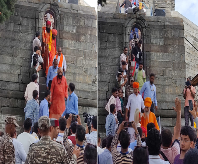 शंकराचार्य मंदिर में छड़ी पूजन के बाद वापस लौटते दीपेंद्र गिरि जी महाराज व अन्य श्रद्धालु।