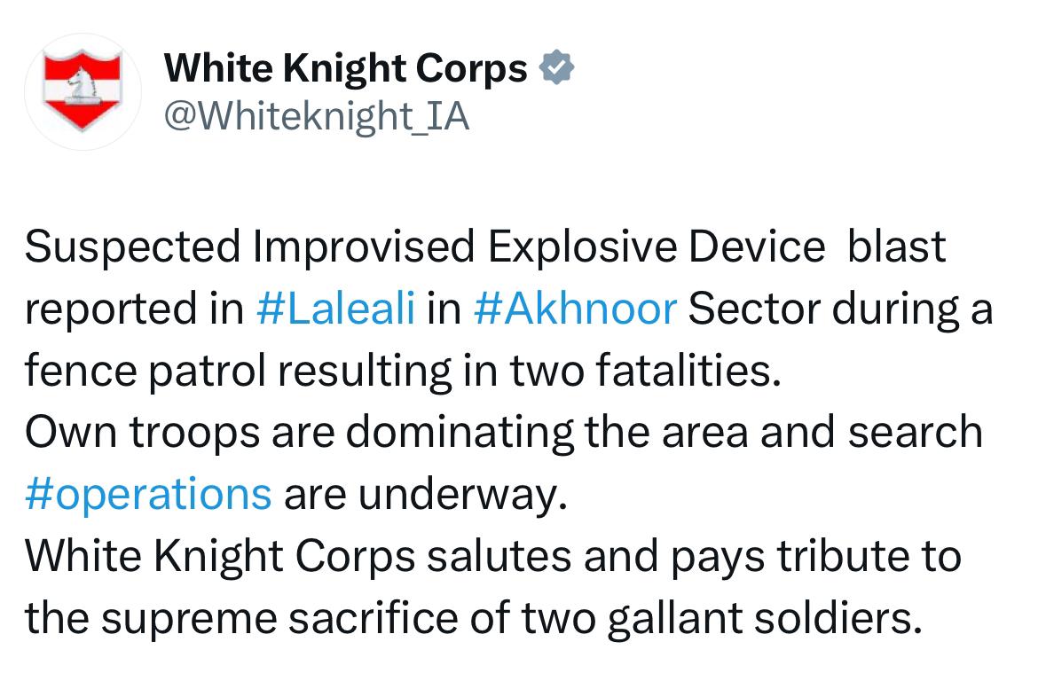 सेना की व्हाइट नाइट कोर ने एक्स पर पोस्ट कर बलिदानी जवानों के प्रति श्रद्धांजलि अर्पित की है। कोर ने लिखा, अखनूर सेक्टर के लालेली में बाड़ के पास गश्त के दौरान संदिग्ध इम्प्रोवाइज्ड एक्सप्लोसिव डिवाइस विस्फोट की खबर मिली है, जिसमें दो लोगों की मौत हो गई है। हमारे सैनिक क्षेत्र पर नियंत्रण बनाए हुए हैं और तलाशी अभियान जारी है। व्हाइट नाइट कोर दो बहादुर सैनिकों के सर्वोच्च बलिदान को सलाम करता है और श्रद्धांजलि देता है।
