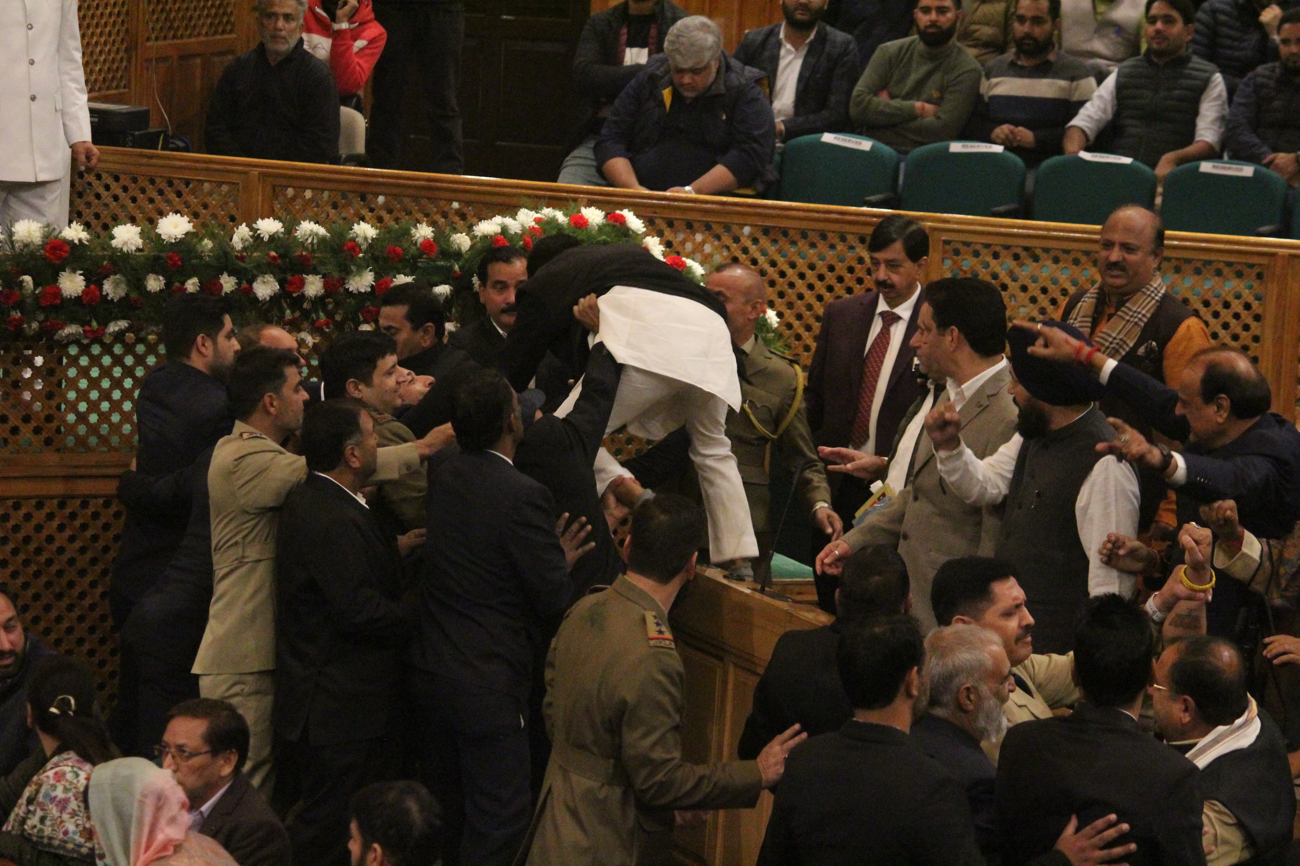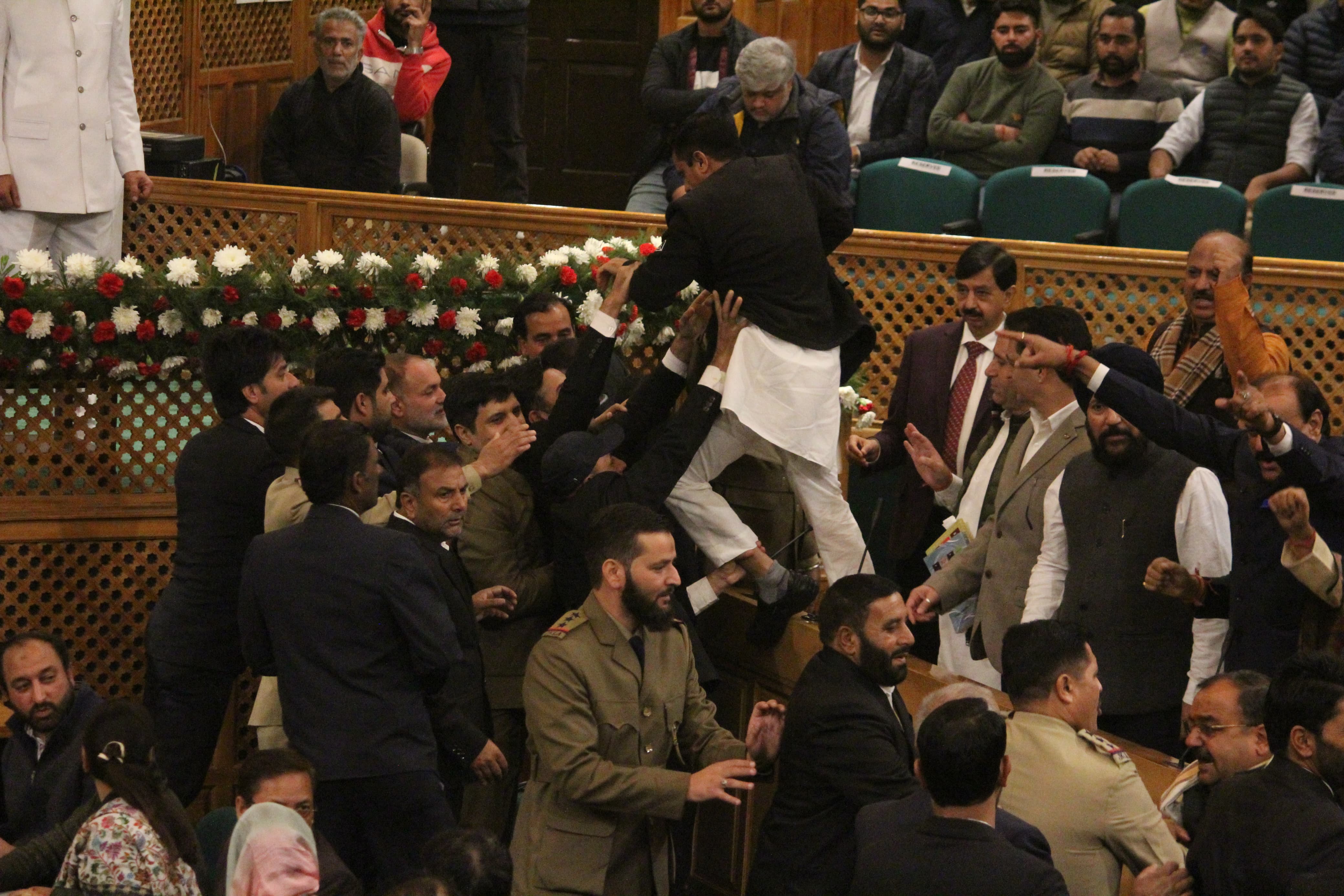 इन्होंने कैदियों की रिहाई अनुच्छेद 370 की बहाली का एक पोस्टर लेकर जैसे ही बेल में दाखिल होने की कोशिश की कोशिश लेकर भाजपा के विधायक अपनी सीटों से उठकर आगे आए और उनके साथ धक्का-मुक्की हो गई और स्पीकर ने सदन को स्थगित कर दिया।