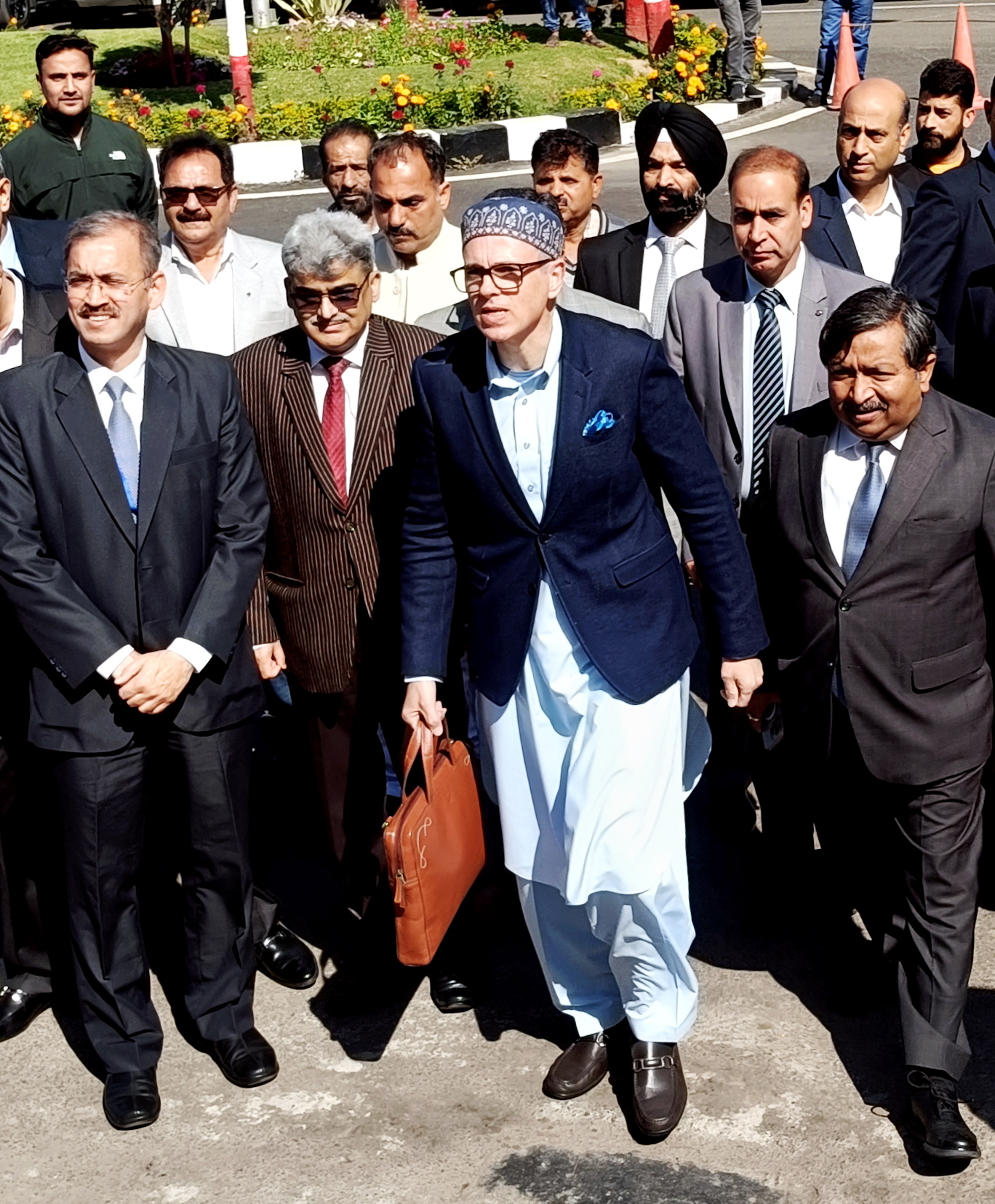 जम्मू-कश्मीर के मुख्यमंत्री उमर अब्दुल्ला शुक्रवार राज्य का बजट 2025-26 पेश करने जम्मू पहुंचे। (पीटीआई फोटो)