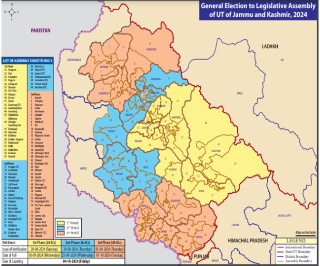 पहले चरण का चुनाव 18 सितंबर, दूसरे चरण का चुनाव 25 सितंबर तो तीसरे चरण का चुनाव एक अक्टूबर को होगा। वहीं चुनाव परिणाम चार अक्टूबर को सामने आएंगे। मौजूदा समय में केंद्रशासित प्रदेश में 90 विधानसभा सीटें हैं। इस तरह किस विधानसभा सीट पर कब चुनाव होगा। आइए, इस बारे में जान लेते हैं।