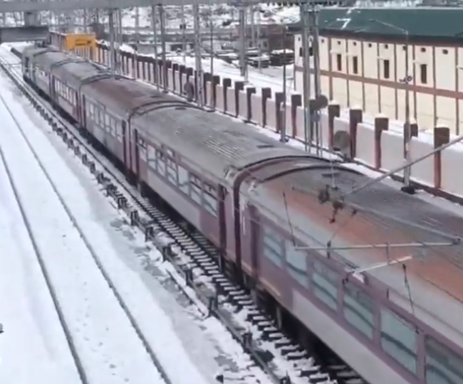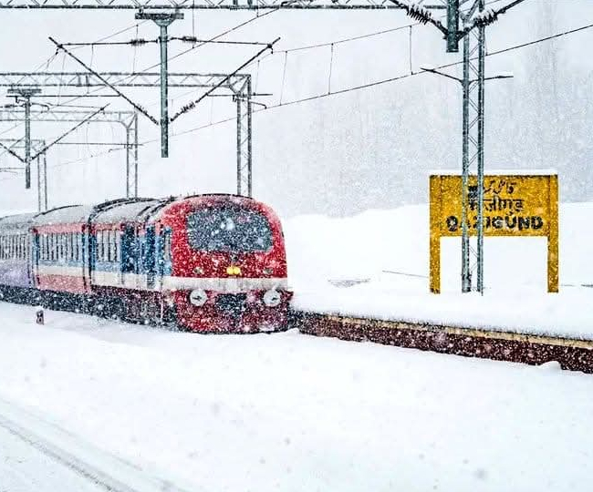 बनिहाल रेलवे स्टेशन से गुजरती मेमू ट्रेन, शुक्रवार को हुई बर्फबारी से ट्रेक सफेद चादर से ढक गए। बावजूद इसके ट्रेन बर्फ को चीरते हुए अपने गंतव्य की ओर बढ़ती गई। गुलमर्ग, सोनमर्ग और पहलगाम जैसे पर्यटक स्थलों सहित घाटी के ऊंचे इलाकों में मध्यम से भारी बर्फबारी का क्रम जारी है।