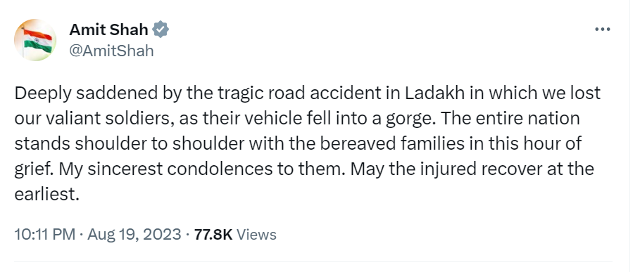 केंद्रीय गृह मंत्री अमित शाह ने ट्विटर पर लिखा, "लद्दाख में दुखद सड़क दुर्घटना से बहुत दुखी हूं, जिसमें हमने अपने बहादुर सैनिकों को खो दिया। दुख की इस घड़ी में पूरा देश शोक संतप्त परिवारों के साथ कंधे से कंधा मिलाकर खड़ा है। उनके प्रति मेरी हार्दिक संवेदनाएं। घायल जवान के जल्द ठीक होने की कामना करता हूं।"