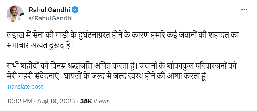 कांग्रेस सांसद राहुल गांधी ने ट्विटर पर लिखा, "लद्दाख में सेना की गाड़ी के दुर्घटनाग्रस्त होने के कारण हमारे कई जवानों की शहादत का समाचार अत्यंत दुखद है। सभी शहीदों को विनम्र श्रद्धांजलि अर्पित करता हूं। जवानों के शोकाकुल परिवारजनों को मेरी गहरी संवेदनाएं। घायलों के जल्द से जल्द स्वस्थ होने की आशा करता हूं।"