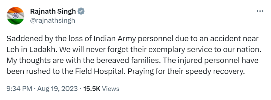 रक्षा मंत्री राजनाथ सिंह ने कहा, "लद्दाख में लेह के पास एक दुर्घटना में भारतीय सेना के जवानों की मौत से दुखी हूं। हम अपने राष्ट्र के प्रति उनकी अनुकरणीय सेवा को कभी नहीं भूलेंगे। मेरी संवेदनाएं शोक संतप्त परिवारों के साथ हैं। घायल जवान को फील्ड अस्पताल ले जाया गया है। उनके शीघ्र स्वस्थ होने की प्रार्थना करता हूं।"