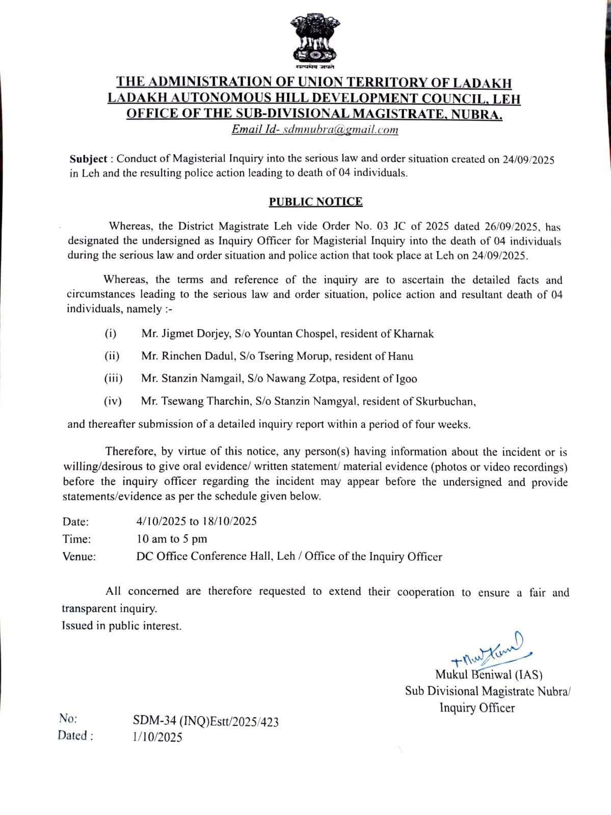 लेह में कैसे हुई चार लोगों की मौत? हिंसा की जांच को लेकर आदेश जारी, SDM मुकुल बेनीवाल को सौंपा जिम्मा