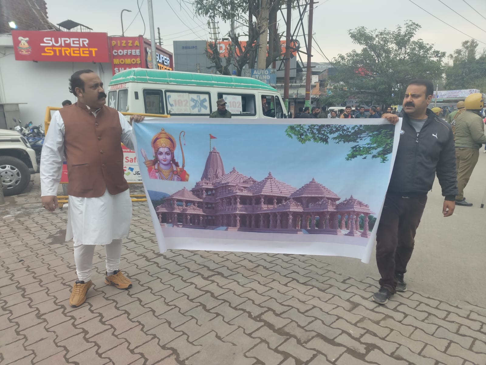 हाथों में राम मंदिर के बैनर लेकर रैली में पहुंच रहे हैं लोग