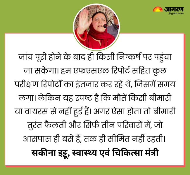 उन्होंने कहा, ये मौतें चिंता का विषय हैं और पुलिस व जिला प्रशासन इस रहस्य से पर्दा उठाने के लिए तेजी से जांच करेगा। इस बीच, स्थानीय लोगों में लगातार डर और रोष बढ़ रहा है और उन्होंने प्रशासन के खिलाफ प्रदर्शन भी किया। बडाल गांव में सात से 16 दिसंबर 2024 के बीच दो परिवारों के नौ सदस्यों की मौत हो गई थी। इसके बाद 11 जनवरी को स्थानीय निवासी मोहम्मद असलम के छह बच्चे बीमार हुए, जिनमें चार की मौत हो चुकी है।