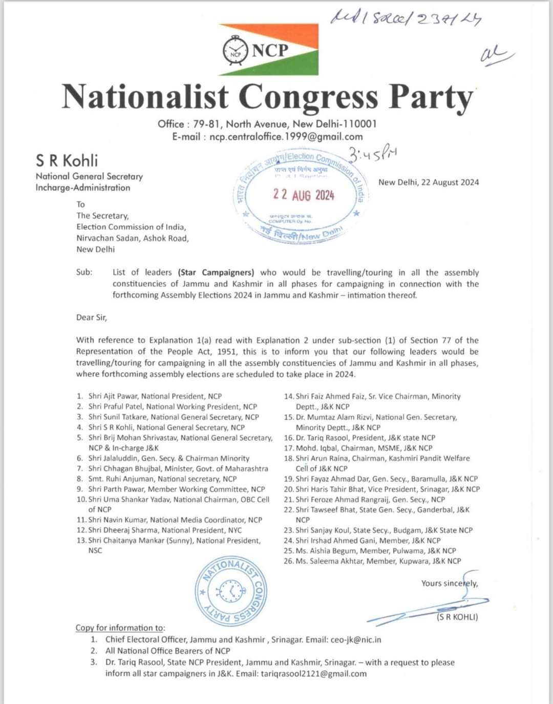 Jammu Kashmir Assembly Election 2024 जम्मू कश्मीर में विधानसभा चुनाव के लिए एनसीपी ने स्टार प्रचारकों की लिस्ट जारी कर दी है। इस सूची में 26 प्रचारकों के नाम सहित अजीत पवार प्रफुल्ल पटेल और सुनील तटकरे भी शामिल हैं। जम्मू कश्मीर में तीन चरणों में चुनाव होने जा रहा है। इसके लिए सभी राजनीतिक पार्टियां तैयारियों में जुटी है।