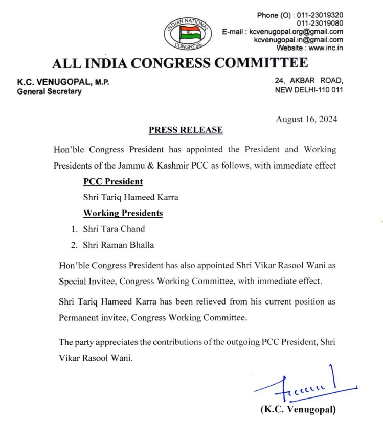 हालांकि, रमन भल्ला पहले से ही कार्यवाहक प्रधान थे। पार्टी के अखिल भारतीय संगठन महासचिव केसी वेणुगोपाल की तरफ से जारी विज्ञप्ति में कहा गया कि तत्काल प्रभाव से तारिक हमीद कर्राप्रदेश कांग्रेस के नए प्रधान होंगे। विकार रसूल को कांग्रेस वर्किंग कमेटी में विशेष आमंत्रित सदस्य बनाया गया है वहीं तारिक हमीद कर्राको विशेष आमंत्रित सदस्य की जिम्मेदारी से मुक्त कर दिया गया है।