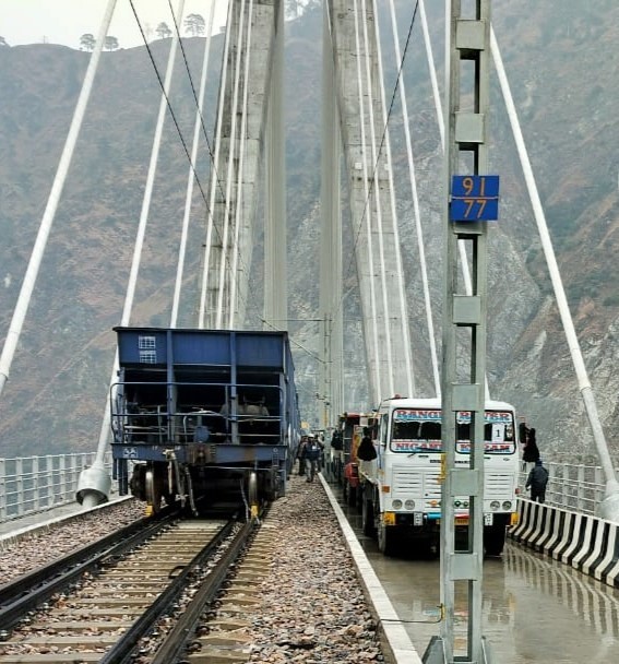 फोटो: जम्मू संभाग के रियासी जिला में अंजी खड्ड पर बने देश के पहले केवल स्टे ब्रिज के लोड टेस्ट के लिए ब्रिज पर खड़े डंपर और मालगाड़ी