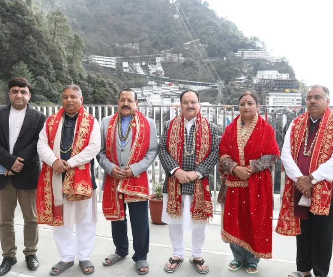 संवाद सहयोगी, कटड़ा। केंद्रीय स्वास्थ्य, रसायन और उर्वरक मंत्री तथा भाजपा के राष्ट्रीय अध्यक्ष जेपी नड्डा तथा केंद्रीय राज्यमंत्री डॉ जितेंद्र सिंह ने श्री माता वैष्णो देवी तीर्थस्थल का दौरा हाजिरी लगाई। भवन पर उनके आगमन पर श्री माता वैश्नो देवी श्राइन बोर्ड के मुख्य कार्यकारी अधिकारी अंशुल गर्ग ने स्वागत किया।