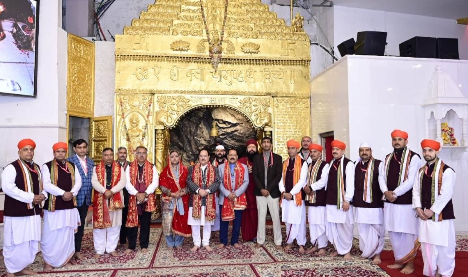फोटो कैप्शन: मां वैष्णो देवी के दर्शनों के उपरांत पवित्र व प्राचीन गुफा मे पुजारीयों के साथ केंद्रीय मंत्री जेपी. नड्डा व अन्य। फोटो श्राइन बोर्ड।
