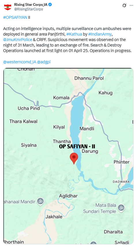 Search Operation in Kathua कठुआ में सोमवार देर रात आतंकियों और सुरक्षाबलों के बीच मुठभेड़ हुआ। खुफिया सूचनाओं के आधार पर चलाए गए सर्च ऑपरेशन के दौरान संदिग्ध गतिविधि देखी गई जिसके कारण गोलीबारी हुई। मंगलवार सुबह फिर से तलाशी और आतंकियों के खात्मे का अभियान शुरू किया गया। भारतीय सेना से मिली जानकारी के मुताबिक इलाके में आज भी सर्च ऑपरेशन जारी है।