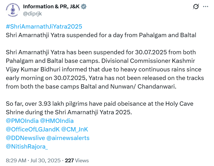 जम्मू-कश्मीर सूचना और जनसंपर्क विभाग के मुताबिक, सुबह से हो रही भारी बारिश के कारण आज पहलगाम और बालटाल दोनों बेस शिविरों से श्री अमरनाथजी यात्रा स्थगित कर दी गई है। श्री अमरनाथजी यात्रा 2025 के दौरान अब तक 3.93 लाख से ज़्यादा तीर्थयात्री पवित्र गुफा में दर्शन कर चुके हैं।