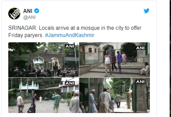 शुक्रवार होने के बावजूद पूरी वादी में शांति रही। सभी मस्जिदों में शांतिपूर्वक नमाज संपन्न हुई। ज्ञात हो, जम्मू संभाग में भी इंटरनेट सेवा पूरी तरह ठप है। पांच जिलों जम्मू, सांबा, कठुआ, रियासी व ऊधमपुर में मोबाइल और टेलीफोन सेवा सुचारू रूप से चल रही है, जबकि अन्य जिलों में मोबाइल सेवा ठप है।