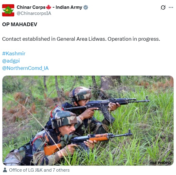 भारतीय सेना की चिनार कोर द्वारा एक्स हैंडल पर भी पोस्ट डाला गया था कि लिडवास इलाके में मुठभेड़ शुरू हो गई है और तीन आतंकियों को सेना ने ढेर कर दिया है।