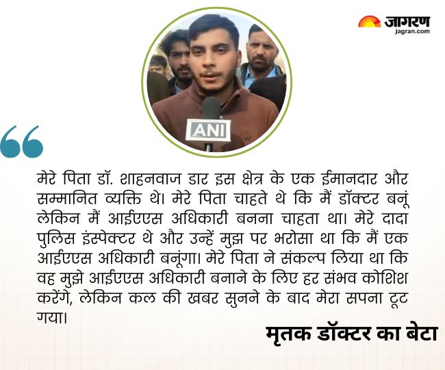 रविवार को गांदरबल जिले के गगनगीर में एक निर्माण स्थल पर आतंकवादियों की गोलीबारी में एक डॉक्टर, एक डिजाइनर और पांच निर्माण श्रमिकों की मौत हो गई। गगनगीर आतंकी हमले में मारे गए सात लोगों में से एक डॉ. शाहनवाज डार के बेटे ने सोमवार को अपने पिता की मौत पर दुख जताया और कहा है कि उनके पिता की मौत ने उनके सपने को चकनाचूर कर दिया है।