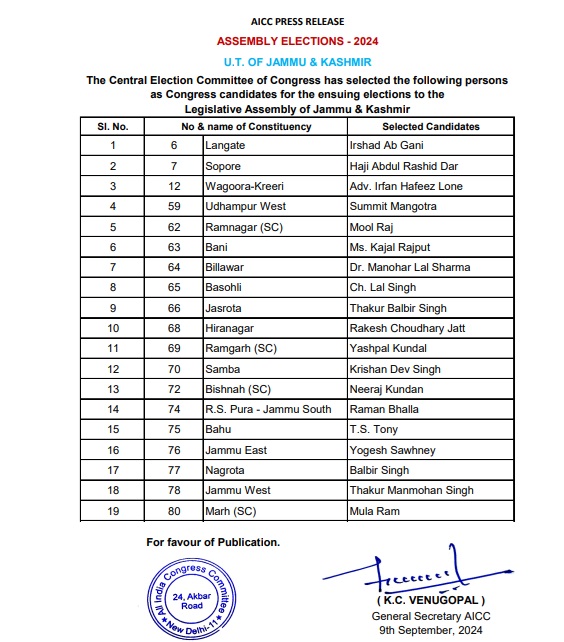 J&K Election: कांग्रेस ने जारी की तीसरी लिस्ट, 19 सीटों पर उम्मीदवारों का एलान