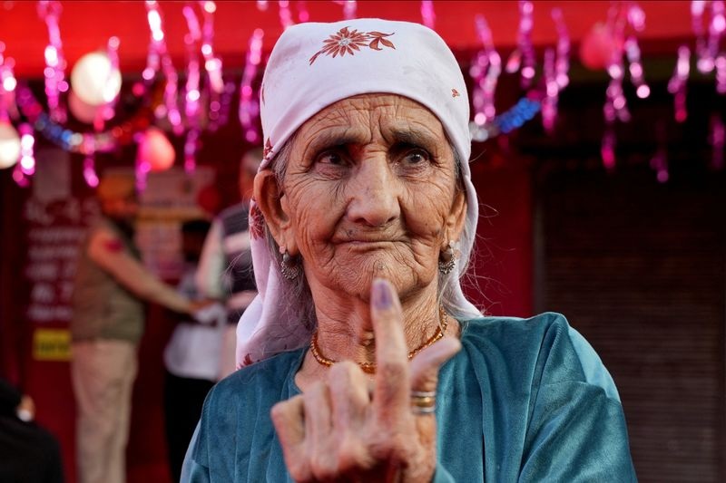दक्षिण कश्मीर के बिजबेहरा शहर में विधानसभा चुनाव के पहले चरण के दौरान एक मतदान केंद्र पर वोट डालने के बाद 90 वर्षीय आयशा अपनी स्याही लगी उंगली दिखाती हुईं।