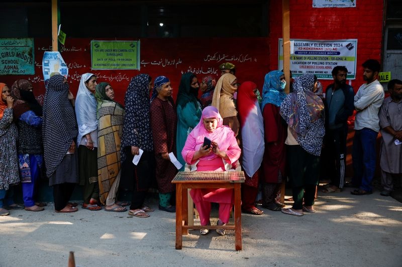 दक्षिण कश्मीर के कोकेरनाग में विधानसभा चुनाव के पहले चरण के दौरान एक मतदान केंद्र पर वोट करने के लिए कतार में खड़ी कश्मीरी महिलाएं। केंद्रशासित प्रदेश में अलगाववाद, आतंकवाद और पाकिस्तान जैसे मुद्दों से हटकर मूलभूत और विकास से जुड़े मुद्दों को अहमियत दी जा रही है।