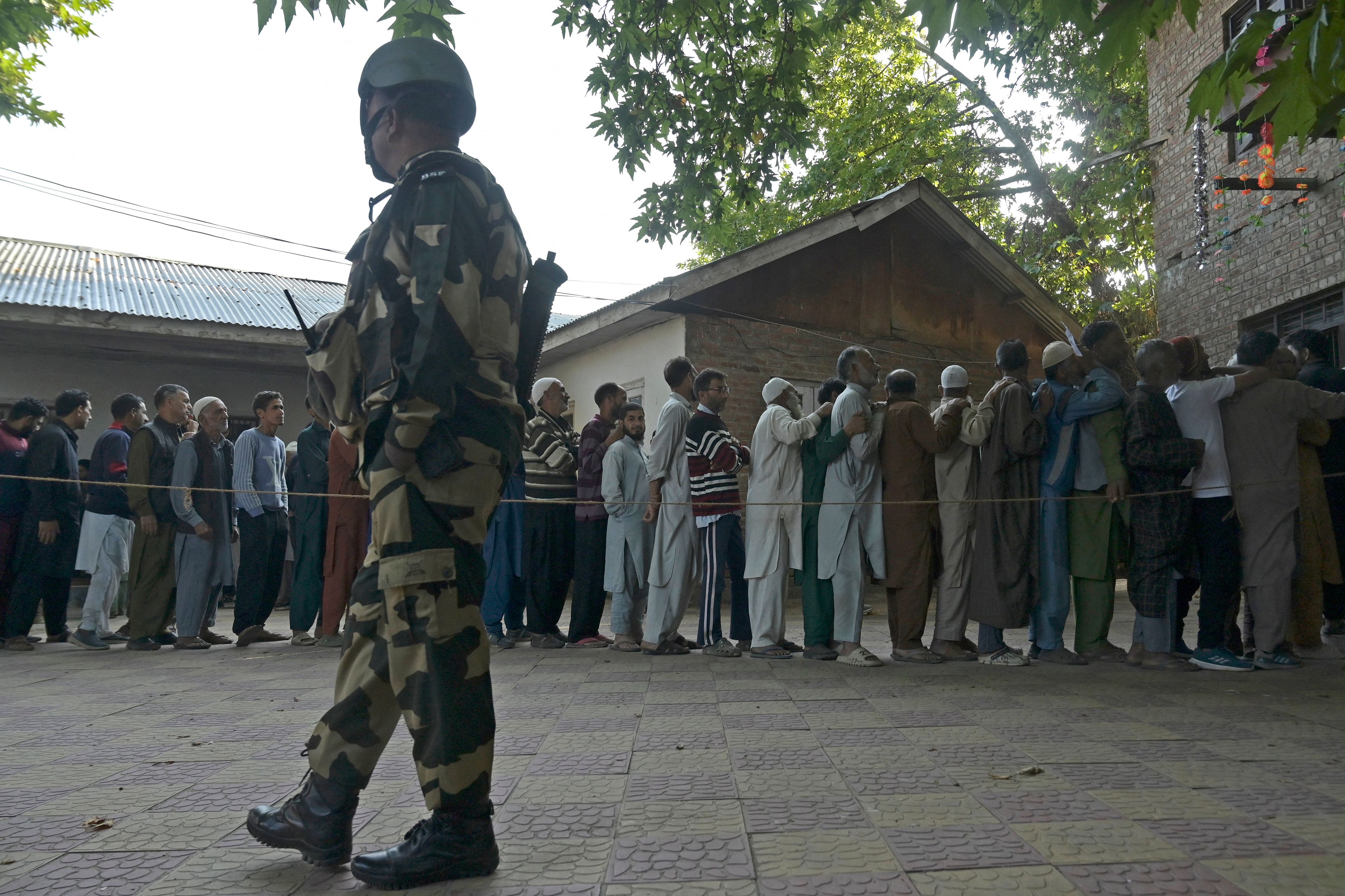 पुलवामा में एक मतदान केंद्र पर वोट डालने के लिए मतदाताओं की कतार के बीच एक भारतीय सुरक्षाकर्मी। धारा 370 हटने के बाद जम्मू-कश्मीर केंद्रशासित प्रदेश में पहली बार चुनाव हो रहा है। इससे पहले विधानसभा चुनाव साल 2014 में हुआ था।