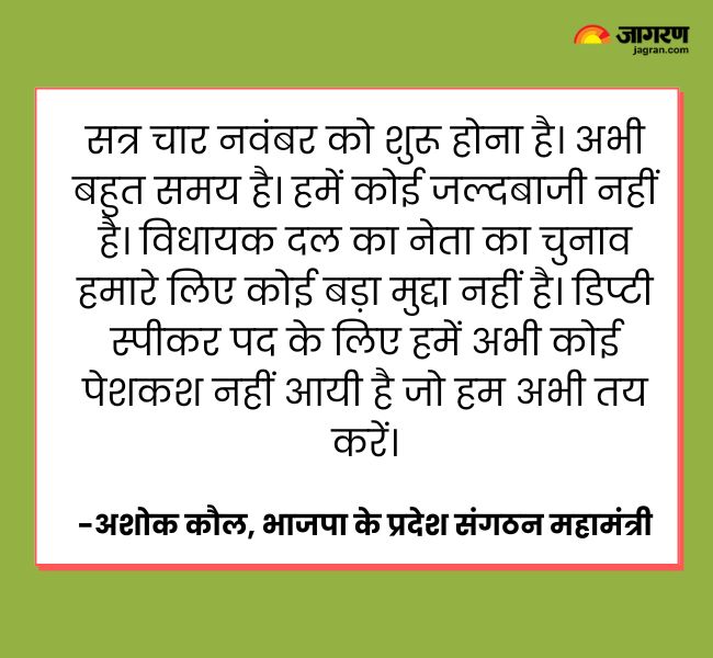 प्रदेश भाजपा के एक वरिष्ठ नेता का कहना है कि संगठन में अभी तक विधायक दल के नेता या डिप्टी स्पीकर पद को लेकर निकट भविष्य में किसी बैठक की संभावना नहीं है। यह निर्णय भाजपा आलाकमान द्वारा पर्यवेक्षकों की सिफारिशों के अनुसार ही लिया जाएगा।