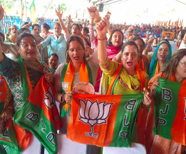 महिला कार्यकर्ता हाथ में बीजेपी का झंडा लिए भारत माता की जय के नारे लगा रही हैं। कार्यकर्ताओं में गजब का जोश दिख रहा है। पूरा पलोड़ा मैदान भगवे कलर से सज गया है।