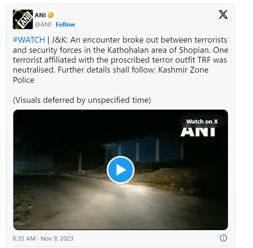 एजेंसी एएनआई के मुताबिक, अधिकारियों ने कहा कि गुरुवार को जम्मू और कश्मीर के शोपिंया के कैथोहलान इलाके में टीआरएफ से जुड़ा एक आतंकवादी मार गिराया।