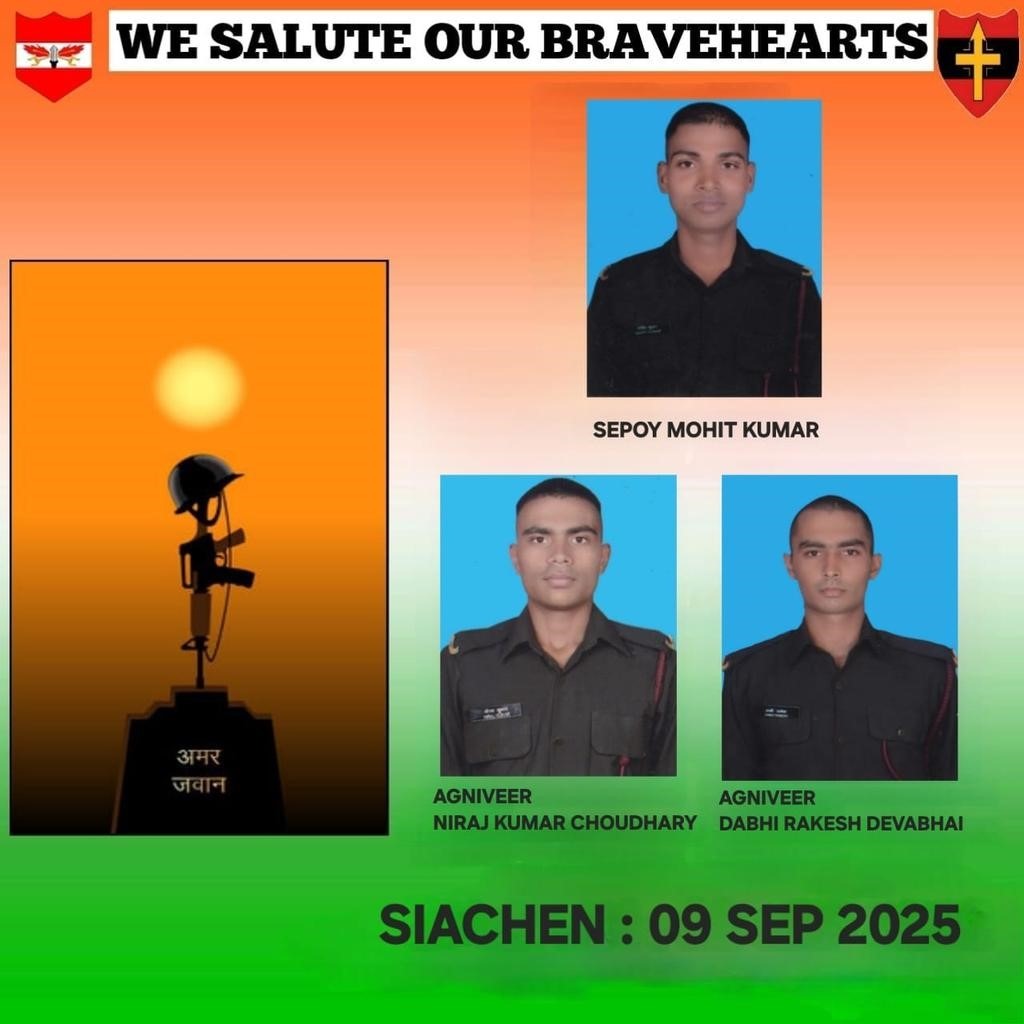 उन्होंने कहा है कि जवानों का यह बलिदान देश की सेवा व संप्रभुता की रक्षा के लिए उनकी अटूट निष्ठा और साहस को दर्शाता है। भारतीय सेना इस दुख की घड़ी में शहीदों के परिजनों के साथ कंधे से कंधा मिलाकर खड़ी है। सियाचिन में बलिदान देने वाले सैनिक मोहित कुमार उत्तर प्रदेश के निवासी हैं। वहीं बलिदानी अग्निवीर डाभी राकेश देवाभाई गुजरात व अग्निवीर नीरज कुमार चौधरी झारखंड के रहने वाले हैं।
