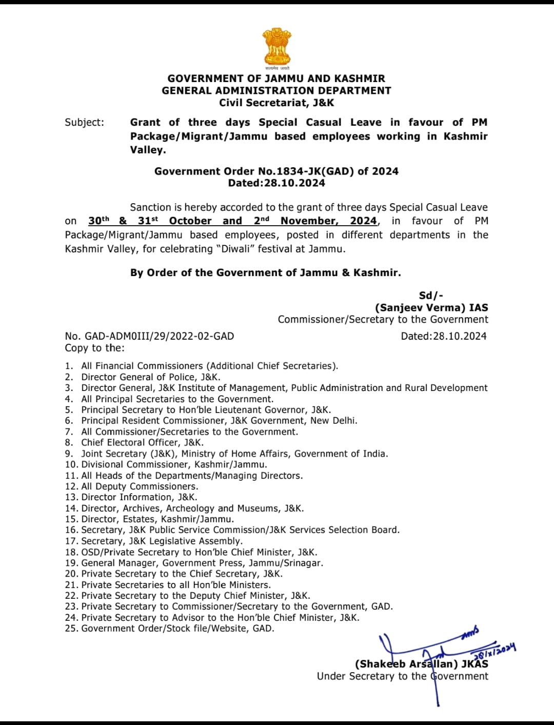 Jammu and Kashmir जम्मू-कश्मीर सरकार ने सोमवार को तीन दिवसीय दीवाली उत्सव अवकाश की घोषणा की है। यह अवकाश कश्मीर घाटी में कार्यरत पीएम पैकेज/प्रवासी/जम्मू के कर्मचारियों को मिलेगा। आदेश के मुताबिक दीवाली पर इन कर्मचारियों को त्योहार मनाने के लिए 30 31 अक्टूबर और 2 नवंबर को अवकाश मिलेगा। प्रदेश के सभी विभागों का यह आदेश प्रेषित कर दिया गया है।