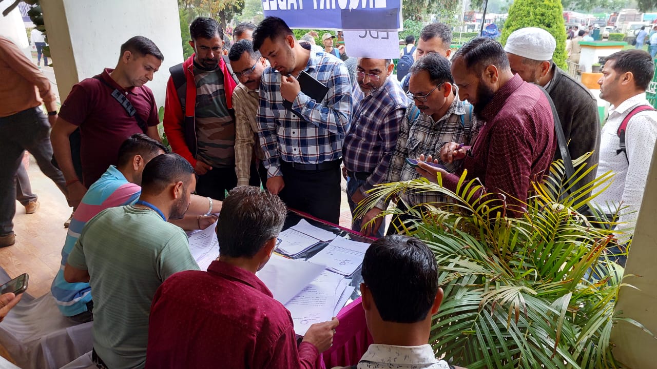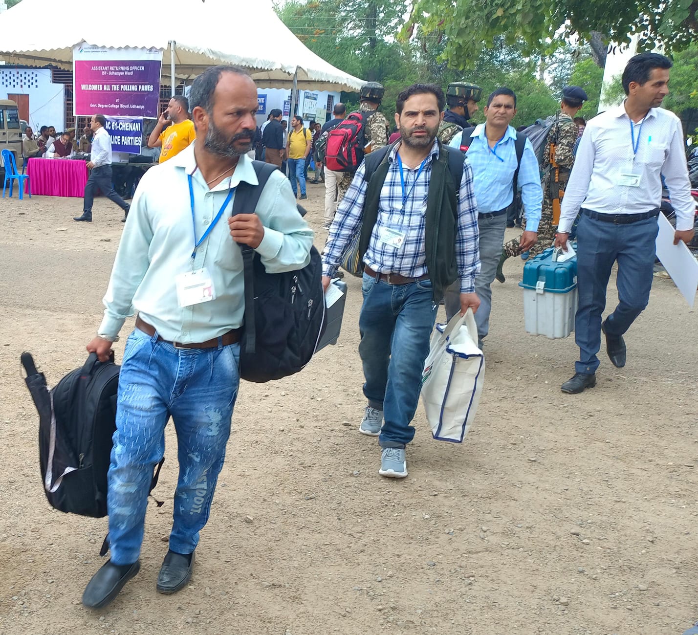 लोकसभा चुनाव के लिए पोलिंग पार्टियों को रवाना किया जा रहा है सरकारी डिग्री कॉलेज उधमपुर से अपने मतदान केंद्र के लिए चुनाव सामग्री व ईवीएम मशीन के साथ रवाना होते चुनाव कर्मचारी।