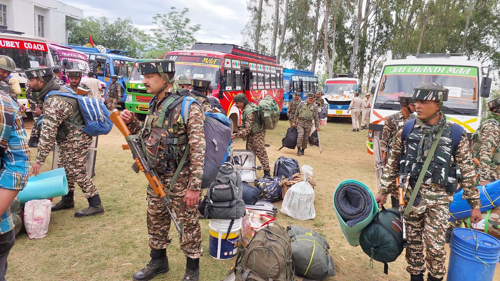 पोलिंग पार्टियों के साथ निकलते सुरक्षाकर्मी।