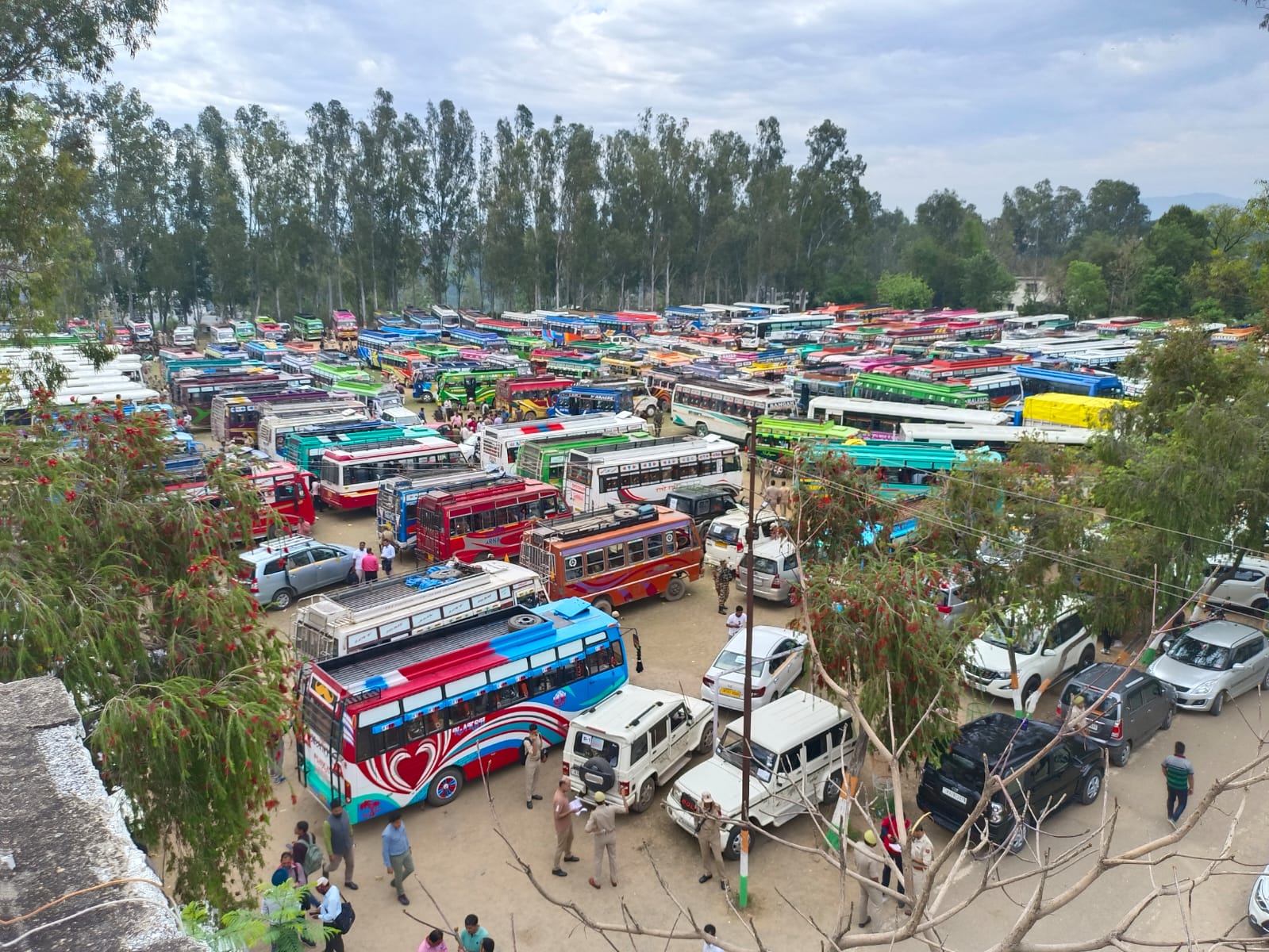 उधमपुर कठुआ संसदीय क्षेत्र में कल होने वाले मतदान के लिए कोटवा जिला के स्पोर्ट्स स्टेडियम से मतदान केद्रों में मतदान कर्मियों को ड्यूटी पर ले जाने के लिए चुनाव कार्यालय द्वारा तैयार की गई बसें।