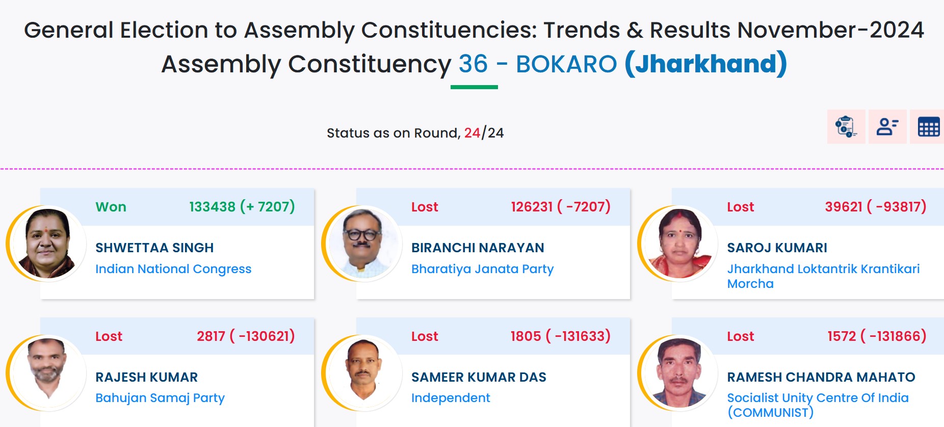 बोकारो विधानसभा सीट पर कांग्रेस प्रत्याशी श्वेता सिंह हुई विजयी
